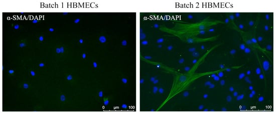 Although HBMECs with cobblestone morphology were negative for alpha-smooth muscle actin (α-SMA), few cells with elongated morphology displayed positive staining for α-SMA (Figure 3), a marker for pericytes and myofibroblastic cells [11].