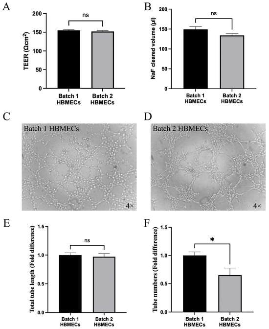 Human brain microvascular cells (HBMECs) with different morphology and characteristics formed equally tight and functional blood–brain barrier in the presence of human astrocytes and pericytes. These were supported by similar TEER readings (A) and a similar level of paracellular flux of sodium fluorescein (B). HBMECs with cobblestone morphology formed more circular (C,D) and greater numbers (E,F) of tubules on Matrigel than elongated counterparts. Data are expressed as mean ± SEM from three independent experiments. * p < 0.05 compared to batch 1, ns = not significant compared to batch 1.