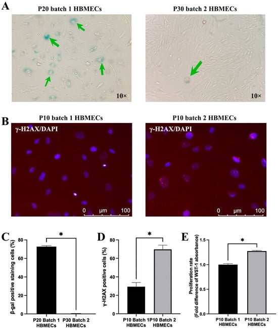 Human brain microvascular endothelial cells (HBMECs) with cobblestone morphology stained positive for SA-β-gal at earlier passages as indicated by green arrows (A,C). They also showed relatively lower DNA damage at earlier passages (B,D). The same cells had lower proliferation rates compared to those with elongated morphology (E). Data are expressed as mean ± SEM from three separate experiments. * p < 0.05 compared to batch 1.