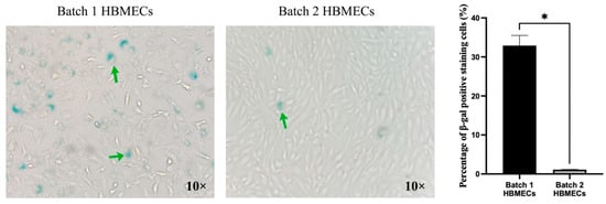 Human brain microvascular endothelial cells (HBMECs) with elongated morphology better resist H2O2-induced premature senescence. Green arrows indicate cells stained positive for SA-β-gal. Data are expressed as mean ± SEM from three independent experiments. * p < 0.05 compared to batch 1.