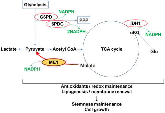 NADPH produced by ME1 plays important roles in other biological processes, including antioxidant stress and detoxification pathways, as well as the generation of reactive oxygen species (ROS). ME1, isocitrate dehydrogenase 1 (IDH1), and two enzymes of the pentose phosphate pathway (PPP), glucose-6-phosphate dehydrogenase (G6PD) and 6-phosphogluconate dehydrogenase (6PGD), are involved in maintaining an adequate pool of NADPH [3,4,5].