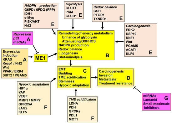 Figure 2. Roles of ME1 in cancer. A. Factors that affect ME1 expression. B. Biochemical changes caused by ME1 in cancer cells. C. Changes caused by ME1 in the phenotype of cancer cells. D. Changes caused by ME1 in the clinical dramatype of cancer cells. E. Factors that cooperate with the biochemical activity of ME1. F. Factors that act cooperatively on ME1-induced cancer cell phenotypes. G. Drugs targeting ME1. ME1, malic enzyme; EMT, epithelial–mesenchymal transition; NADPH, nicotinamide adenine dinucleotide phosphate; IDH1, isocitrate dehydrogenase 1; PPP, pentose phosphate pathway; G6PD, glucose-6-phosphate dehydrogenase; 6PGD, 6-phosphogluconate dehydrogenase; Keap1, Kelch-like ECH-associated protein 1; NRF2, nuclear factor erythroid 2-related factor 2; PPAR, peroxisome proliferator-activated receptor; EGR4, early growth response protein 4; SIRT2, sirtuin 2; PGAM5, phosphoglycerate mutase 5; miRNA, microRNA; PDH, pyruvate dehydrogenase; GLUT1, glucose transporter type 1; OXPHOS, oxidative phosphorylation; TME, tumor microenvironment; HIF, hypoxia-inducible factor; YAP, Yes-associated protein; PDL1, programmed death ligand 1; MCT1, monocarboxylate transporter 1; PK, pyruvate kinase; GLUD1, glutamate dehydrogenase 1; GSH, glutathione; PTGR1, prostaglandin reductase 1; TXNRD1, thioredoxin reductase 1; KLF5, Krüppel-like factor 5; VEGF, vascular endothelial growth factor; MMP, matrix metallopeptidase; GPRC5A, G protein-coupled receptor class C group 5 member A; JAG2, jagged canonical Notch ligand 2.