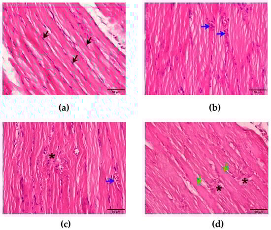 (a) Morphological changes of rat diaphragm after i.m. administration of saline (200 µL) showing the nucleus of the skeletal muscle cell (black arrows: H&E staining: scale bar = 50 µm). Morphological changes of rat diaphragm following administration of N. kaouthia venom (2 mg/kg) for (b) 60 and (c) 90 min showing red blood cell aggregations (blue arrow: H&E staining; scale bar = 50 µm) and myofibril ruptures (black asterisk: H&E staining; scale bar = 50 µm), respectively. (d) Morphological changes of rat diaphragm following the administration of N. kaouthia venom (2 mg/kg) for 4 h (H&E staining; scale bar = 50 µm: black asterisks indicate myofibril ruptures, green arrows indicate muscle hypertrophy).