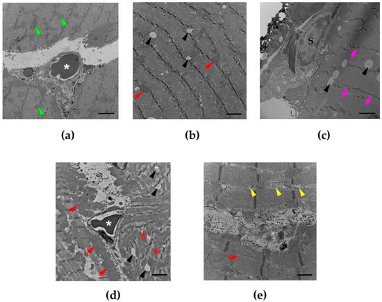 The administration of saline (i.m.) did not affect the nucleus or mitochondria of the rat diaphragms. No histopathological change was observed (Figure 1a, Figure 2a and Figure 3a,b). The administration of N. kaouthia venom (2 mg/kg, i.m.) for 60 min caused a mild skeletal muscle fibre atrophy and red blood cell aggregation (Figure 1b). Myofibril rupture, mitochondrial swelling and the presence of zig-zagging of the Z-band were observed following venom administration for 90 min (Figure 1c and Figure 2b,c). Following the i.m. administration of N. kaouthia venom for 4 h, severe muscle fibre degeneration, red blood cell aggregation and a high degree of mitochondrial swelling and rupture including intramyocellular lipid droplets were detected (Figure 1d, Figure 2d,e and Figure 3c,d, Table 2).