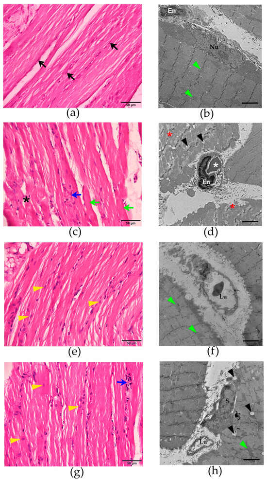 Morphological changes of the rat diaphragm after the i.m. administration of (a) saline (200 µL) showing the nucleus of the skeletal muscle cell (black arrows; H&E staining; scale bar = 50 µm) and (b) the mitochondria (green arrowheads; TEM image; scale bar = 2 µm). (c) Morphological changes of rat diaphragm (H&E staining; scale bar = 50 µm) following the administration of N. kaouthia venom (2 mg/kg: i.m.) for 4 h showing myofibril ruptures (black asterisks), red blood cell aggregations (blue arrow) and skeletal muscle hypertrophy (green arrows). (d) TEM image of rat diaphragm (scale bar = 2 µm) following the administration of N. kaouthia venom (2 mg/kg: i.m.) for 4 h shows high degree of muscle fibre degeneration (red asterisks), endothelial cell swelling (En), the appearances of red blood cells (white asterisk) and intramyocellular lipid droplets (black arrowheads). (e) H&E staining image and (f) TEM analysis (scale bar = 2 µm) of the rat diaphragm after i.v. administration of N. kaouthia monovalent antivenom (NKAV) for 30 min following experimental N. kaouthia envenomation (2 mg/kg, i.m.) show satellite cells (yellow arrowheads) and mitochondria (green arrowheads). (g) H&E staining image and (h) TEM analysis of the rat diaphragm after i.v. administration of NKAV at 90 min following the administration of N. kaouthia (2 mg/kg, i.m.) show the satellite cells (yellow arrowheads), red blood cell aggregations (blue arrow), intramyocellular lipid droplets (black arrowheads) and the mitochondria (green arrowheads). ‘Lu’ indicates the lumen of blood vessels. ‘En’ indicates endothelial cell swelling. ‘Nu’ indicates the nucleus. ‘S’ indicates the nucleus of satellite cells.