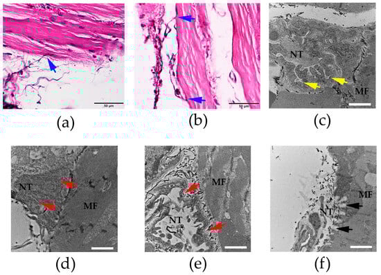 Morphological changes of the rat diaphragm (H&E staining; scale bar = 50 µm) after the i.m. administration of (a) saline (200 µL) and (b) N. kaouthia venom (2 mg/kg) showing the nerve terminal of nerve fibres (blue arrows). (c) Transmission electron microscopy image (TEM: scale bar = 2 µm) of the rat diaphragm following the administration of saline showing the synaptic folds of the neuromuscular junction (yellow arrows). (d) The administration of N. kaouthia venom (2 mg/kg: i.m.) for 90 min caused partial degeneration of the synaptic fold under TEM analysis (red arrows: scale bar = 2 µm). (e) TEM image of rat diaphragm shows severe degeneration and loss of the synaptic fold (red arrows) following i.m. administration of N. kaouthia venom (2 mg/kg) for 4 h. (f) The appearance of the synaptic fold (black arrows) in the rat diaphragm (TEM analysis: scale bar = 2 µm) after i.v. administration of NKAV at 30 min following the administration of N. kaouthia (2 mg/kg, i.m.). ‘NT’ indicates nerve terminal. ‘MF’ indicates muscle fibre.