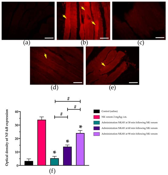 Immunofluorescence analysis (scale bar = 50 µm) of the stimulation of NF-kB in the rat diaphragm tissues following the administration of (a) saline, (b) N. kaouthia venom (NK venom 2 mg/kg, i.m.), (c) N. kaouthia antivenom (NKAV, i.v.) following N. kaouthia venom (2 mg/kg, i.m.) at 30 min, (d) N. kaouthia antivenom (NKAV, i.v.) following N. kaouthia venom (2 mg/kg, i.m.) at 60 min and (e) N. kaouthia antivenom (NKAV, i.v.) following N. kaouthia venom (2 mg/kg, i.m.) at 90 min. (f) A comparison of optical density of NF-kB expression. Data represent the mean ± SEM (* p < 0.0001 compared with the group of NK venom (2 mg/kg, i.m.): # p < 0.0001, there was a significant difference when comparing between the groups, one-way analysis of variance (ANOVA); n = 3–5). Yellow arrows indicate the increase in NF-kB expression.