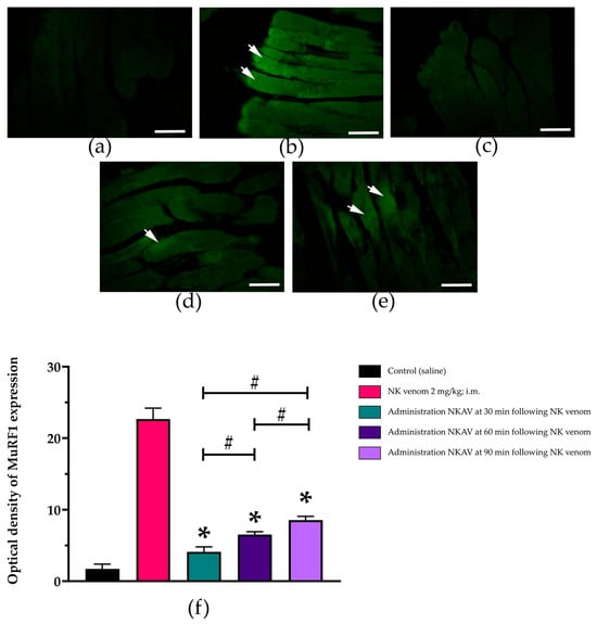 Immunofluorescence analysis (scale bar = 50 µm) of the stimulation of MuRF1 in the rat diaphragm tissues following the administration of (a) saline, (b) N. kaouthia venom (NK venom 2 mg/kg, i.m.), (c) NKAV (i.v.) following N. kaouthia venom (2 mg/kg, i.m.) at 30 min, (d) NKAV (i.v.) following N. kaouthia venom (2 mg/kg, i.m.) at 60 min and (e) NKAV (i.v.) following N. kaouthia venom (2 mg/kg, i.m.) at 90 min. (f) The comparison of optical density of MuRF1 expression. Data represent the mean ± SEM (* p < 0.0001 compared with NK venom (2 mg/kg, i.m.), # p < 0.0001, there was a significant difference when comparing between the groups, one-way ANOVA; n = 3–5). White arrows indicate the increase in MuRF1 expression.
