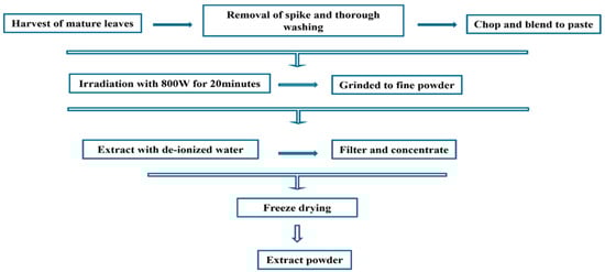 Raw O. humifusa leaves were thoroughly washed with water and the thorns removed. The leaves were then air-dried, chopped into small pieces, and blended into a homogeneous paste. The resulting mixture (500 g) was subjected to microwave irradiation at 800 W for 20 min in a standard microwave oven. After irradiation, the mixture was allowed to cool to an ambient temperature, after which it was milled into a powder. This powder was then resuspended in 500 mL of DI water and centrifuged to dissolve the active components and remove insoluble contaminants. To obtain a pure extract, the suspension underwent filtration through a 0.22 μm filter and was concentrated using a rotary evaporator. The final step involved obtaining the microwave-assisted O. humifusa aqueous extract (MA-OHE) powder by freeze-drying this solution. The schematic of the O. humifusa aqueous extract extraction procedure is shown in Figure 1.