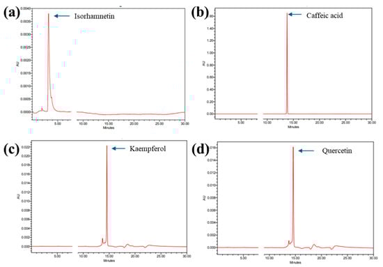 HPLC retention times of standards: (a) isorhamnetin; (b) caffeic acid; (c) kaempferol; (d) quercetin.