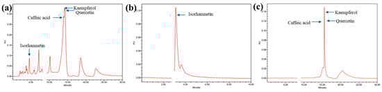 HPLC peaks of (a) MA-OHE, (b) isorhamnetin after fractionation, and (c) caffeic acid, kaempferol, and quercetin (combined) after fractionation.