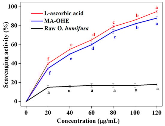 Antioxidant activity of MA-OHE with the standard deviation of the mean derived from three independent experiments (a, b, c, d, e, and f indicate significant differences, p < 0.05).