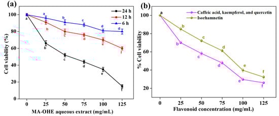 (a) Inhibition of HCT 116-CCL-247 cancer cell proliferation by the MA-OHE at different time points. (b) Percentage of HCT 116-CCL-247 cell viability after incubation with fractionated flavonoids for 24 h. Both figures show a standard deviation of the mean derived from three independent experiments (a, b, c, d, e, and f indicate significant differences, p < 0.05).