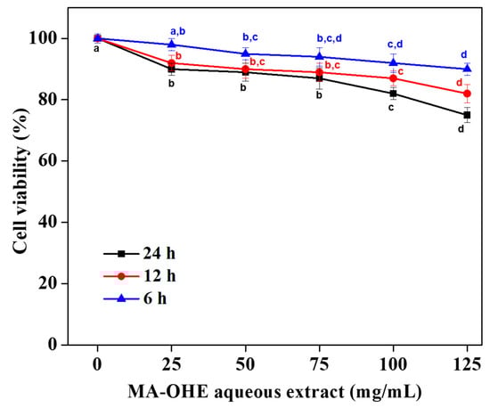 Inhibition of HDFa cell proliferation by the MA-OHE at different time points, with the standard deviation of the mean derived from three independent experiments (a, b, c, and d indicate significant differences, p < 0.05).