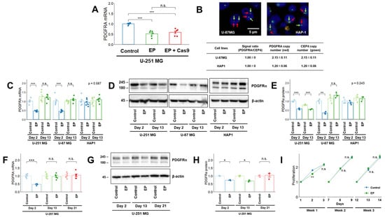 Effects of electroporation on PDGFRA mRNA and PDGFRα expression. (A) Effect of electroporation on PDGFRA mRNA expression in U-251 MG cells. (B) Upper panels: Representative images of the fluorescence in situ hybridization analysis of U-87 MG and HAP1 cells. A probe mix for PDGFRA (red arrows, BAC clone RP11-231C18) and CEP4 (green arrows) was used. Scale bar: 5 μm. Lower panel: PDGFRA and CEP4 signals were calculated by counting the number of signals from 30 cells. The CEP4 signal was used to determine chromosome copy number (ploidy status). The PDGFRA/CEP4 signal ratio was calculated using the following formula: signal ratio = (PDGFRA signal)/(CEP4 signal). (C,D) Effects of electroporation on PDGFRA mRNA (C) and PDGFRα (D) expression in U-251 MG, U-87 MG, and HAP1 cells. (E) Densitometric quantification of the Western blot results in Figure 1D. (F,G) Effects of electroporation on PDGFRA mRNA (F) and PDGFRα (G) expression in U-251 MG cells. (H) Densitometric quantification of the Western blot results in Figure 1G. (I) Cell proliferation was monitored after electroporation in U-251 MG cells using WST-8 assay. Values are presented as fold-increases over those on the day following seeding (n = 6). The day of electroporation was designated as Day 0. Quantitative data are represented as mean ± standard error. *, p < 0.05; **, p < 0.01; ***, p < 0.001; n.s., not significant. PDGFRA, platelet-derived growth factor receptor alpha; EP, electroporation; CEP4, chromosome enumeration probe for chromosome 4.