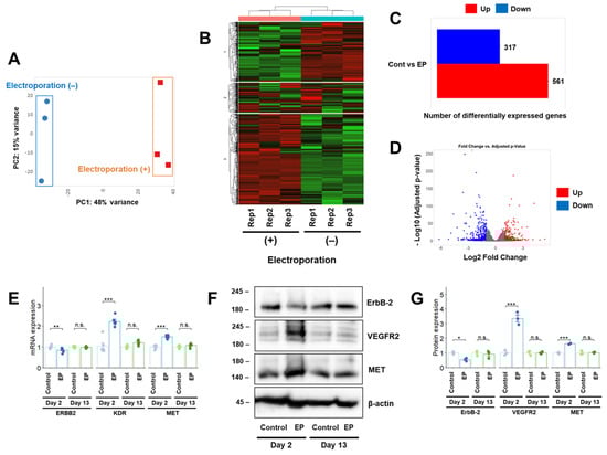 RNA-seq analysis of U-251 MG cells after electroporation. (A–D) Principal component analysis (A), k-means clustering analysis (B), and DEG analyses, (C,D) transcript counts derived from U-251 MG cells treated with or without electroporation using the iDEP application [17]. (E,F) Effects of electroporation on RTK mRNA (E) and protein (F) expression in U-251 MG cells. (G) Densitometric quantification of the Western blot results in (F). The day of electroporation was designated as Day 0. Quantitative data represented as mean ± standard error. *, p < 0.05; **, p < 0.01; ***, p < 0.001; n.s., not significant. Rep1, Rep2, and Rep3 represent the three replicates. EP, electroporation.