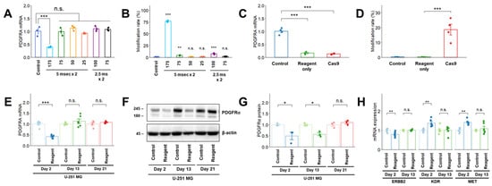 (A–D) Variation in PDGFRA mRNA expression after electroporation under various conditions (A) and lipofection (C) on Day 2 after transfection in U-251 MG cells. Editing activity (modification rate) after electroporation using modified conditions (B) and lipofection (D) on Day 2 after transfection in U-251 MG cells. The modification rate was calculated as the number of reads with modifications (insertion, deletion, and substitution) divided by the number of total reads measured via NGS. (E,F) Effects of lipofection on PDGFRA mRNA (E) and PDGFRα (F) expression in U-251 MG cells. (G) Densitometric quantification of the Western blot results in (F); (H) Effects of lipofection on RTK mRNA expression 2 days after transfection in U-251 MG cells. The day of transfer (electroporation and lipofection) was designated as Day 0. Quantitative data are presented as mean ± standard error. *, p < 0.05; **, p < 0.01; ***, p < 0.001; n.s., not significant.