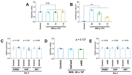 Because virus-mediated Cas9 transfection is available for genome editing [18,19], we used a Cas9 rAAV for Cas9 delivery. The packaging capacity of the rAAV is approximately 4.5 kb [19], and a small Cas9 ortholog [Staphylococcus aureus (SaCas9), approximately 3.1 kb] was used for rAAV construction in this study. PDGFRA mRNA expression levels were not affected on Day 2 after rAAV transfection (Figure 4A), and the modification rate increased in a dose-dependent manner (MOI) (Figure 4B). No change in the mRNA expression of RTKs was observed after rAAV infection (Figure 4C). To confirm that the SaCas9 protein did not affect mRNA expression of PDGFRA and RTKs, mRNA expression levels were measured on Day 2 after mNeonGreen fluorescent protein-expressing rAAV infection at the same MOI, which revealed no changes in mRNA expression (Figure 4D,E).
