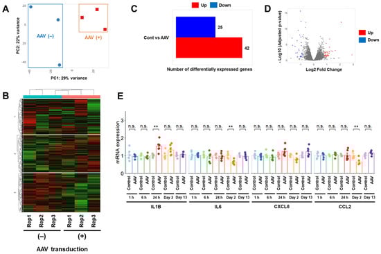RNA-seq analysis after rAAV transduction in U-251 MG cells. (A–D) Principal component (A), k-means clustering (B), and DEG analyses (C,D) for transcript counts derived from U-251 MG cells treated with or without rAAV infection using iDEP [17]. (E) Effects of rAAV infection on mRNA expression of immune-related genes in U-251 MG cells. The day of rAAV infection was designated as Day 0. Quantitative data are presented as mean ± standard error. **, p < 0.01; n.s., not significant. Rep1, Rep2, and Rep3 represent the three replicates.
