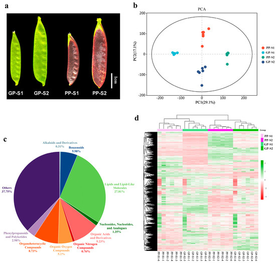 Metabolism data of the two pea accessions of green pods (GPs) and purple pods (PPs). (a). Morphology of GPs and PPs at two stages. S1: the pods at five days after anthesis; S2: the pods at ten days after anthesis; bar =1 cm. (b). Principal component analysis (PCA) of all samples. (c). Classification statistics of all metabolites identified in all samples. (d). Heatmap showing the variation in all differentially accumulated metabolites (DAMs) in all samples. The data used for the heatmap were horizontally normalized; red represents relatively high content, and green represents relatively low content.