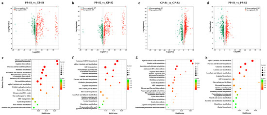 Statistics and function analysis of DAMs between GPs and PPs at two developmental stages. (a–d). Volcano maps of upregulated and downregulated differential metabolites in each comparison group. (e–h). The KEGG pathway enrichment of all DAMs in each comparison group. The ordinate represents the pathway term, and the abscissa represents the rich factor. The sizes of the dots represent the different number of DAMs, and the colors of the dots represent different p values.
