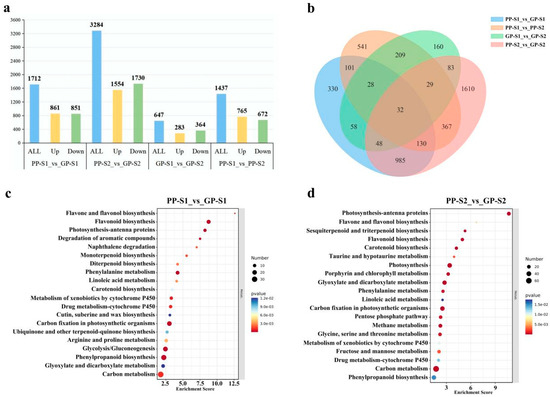 Transcriptome analysis between GPs and PPs at two developmental stages. (a). The statistics of differentially expressed genes (DEGs) identified from the transcriptome. (b). The Venn diagram of the DEGs in each comparison group. (c,d).The top 20 KEGG pathway enrichments of all DEGs in the comparison groups of PP-S1_vs_GP-S1 and PP-S2_vs_GP-S2.