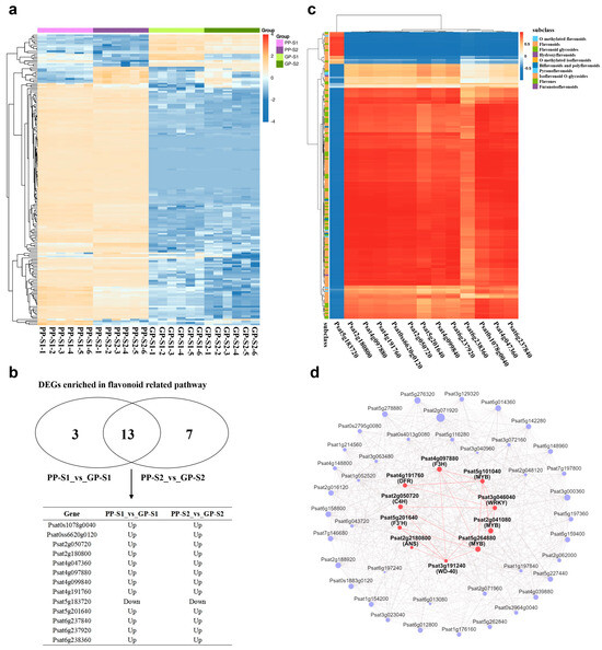Analysis of DAMs and DEGs related to flavonoid metabolism. (a). Heatmap of all DAMs that were classified into flavonoid metabolites. (b). Venn analysis of co-regulated DEGs in PP-S1_vs_GP-S1 and PP-S2_vs_GP-S2 comparisons. (c). The heatmap of correlations between all flavonoid DAMs and 13 co-regulated DEGs involved in the flavonoid biosynthesis pathway. The red/blue lines represent positive/negative correlations. (d). The network of hub genes in the steelblue module identified from the WGCNA. The red dots represent the five structural genes involved in the flavonoid biosynthesis pathway, the WD-40 protein-encoding gene, and four transcription factor genes.