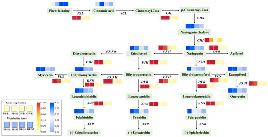 The combined analysis of the transcriptome and metabolome in the flavonoid biosynthesis pathway could systematically reveal the differences in gene expression and metabolite accumulation in the flavonoid biosynthesis pathway between the two pea accessions (Figure 6). In the flavonoid biosynthesis pathway, except for the 4CL, CHS and ANR genes, 21 unigenes encoding nine enzymes were identified as DEGs and upregulated by 2.20- to 258.8-fold in the PP-S1_vs_GP-S1 comparison and by 0.41- to 216.79-fold in the PP-S2_vs_GP-S2 comparison (Table S12). As depicted in Figure 6, the expression levels of the nine structural genes, including PAL, C4H, CHI, F3H, F3’H, F3’5’H, DFR, ANS and FLS (Table S12), were significantly upregulated in the purple pod pea. For flavonoid metabolites, the accumulation trends of major DAMs, including naringenin chalcone, eriodictyol, naringenin, myricetin, dihydromyricetin, kaempferol, leucodelphinidin, delphinidin, cyaniding, and quercetin, were consistent with these upregulated DEGs and were highly reinforced by the higher gene expression levels in the purple pod pea at both developmental stages. The accumulation of three metabolites (cinnamic acid, dihydrokaempferol, and pelargonidin) peaked at one stage in the purple pod, and the phenylalanine level was the opposite of the trend of other flavonoid metabolites.