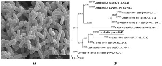 The morphology of the Lactobacillus paracasei L-30 strain was observed using scanning electron microscopy (Figure 1a). To confirm the identification of the Lactobacillus paracasei L-30 strain, a 16S rRNA gene analysis was conducted. The results showed a 99.93% sequence identity with the Lactobacillus paracasei species (Figure 1b).