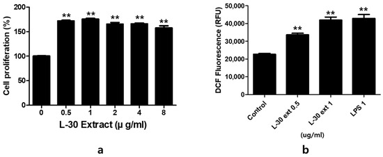 To evaluate the cytotoxicity of the L-30 extract, RAW264.7 was cultured for 24 h with concentrations of 0, 0.5, 1, 2, 4, and 8 µg/mL. The results indicated that at concentrations of the L-30 extract greater than 0.5 µg/mL, cell viability increased by over 70% compared to the control group (Figure 2a). The effects of the L-30 extract on ROS production in RAW264.7 were examined. Following a 24 h treatment with the L-30 extract, the level of ROS generated in macrophages was significantly increased in a dose-dependent manner compared to the control group (Figure 2b). We used lipopolysaccharide (LPS) as a positive control. These results suggest that the L-30 extract is non-cytotoxic and the activation of macrophages increases the generation of ROS.