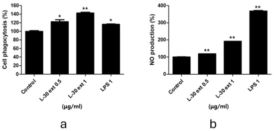 L-30 extract increased phagocytotic and nitric oxide production in RAW264.7 macrophages. (a) Phagocytosis activity of L-30 extract was determined by uptake of neutral red. (b) NO production of L-30 extract was examined using Griess reagent. Results show mean ± standard deviation of three experiments. * p < 0.05 and ** p < 0.01 indicate statistically significant difference compared to control.