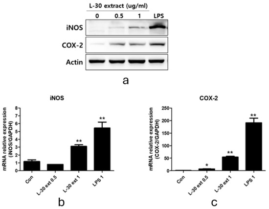 L-30 extract promoted iNOS and COX-2 expression in RAW264.7 macrophages. (a) Quantification of protein levels by Western blot analysis. Quantification of (b) iNOS and (c) COX-2 mRNA levels by qRT-PCR. Results show mean ± standard deviation of three experiments. * p < 0.05 and ** p < 0.01 indicate statistically significant difference compared to control.