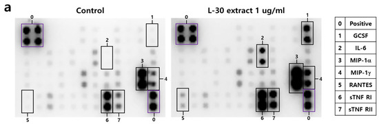 To investigate the cytokines and chemokines secreted by macrophages in response to the L-30 extract, a mouse inflammation cytokine array kit was used to evaluate the trends in 40 cytokines. Among the 40 antibodies, 7 cytokines were significantly altered by the L-30 extract (Figure 5a,b). These cytokines include G-CSF, IL-6, MIP-1α, MIP-1γ, RANTES, sTNF RⅠ, and sTNF RⅡ (Figure 5c). Granulocyte colony-stimulating factor (G-CSF) and IL-6 are substances that activate immune cells by regulating cytokines and inflammatory responses, and the L-30 extract increased both. Macrophage Inflammatory Protein-1 alpha (MIP-1α), Macrophage Inflammatory Protein-1 gamma (MIP-1γ), and RANTES (CCL5) are chemokines that function to attract immune cells to sites of inflammation or infection, and the levels of these were also elevated by the L-30 extract compared to the control. The levels of Soluble Tumor Necrosis Factor Receptor I (sTNF RⅠ) and sTNF RⅡ, which are involved in regulating the TNF pathway, were increased by the L-30 extract as well. Therefore, the L-30 extract showed its potential as an immunostimulatory agent by inducing inflammatory molecules such as G-CSF, IL-6, MIP-1α, MIP-1γ, RANTES, sTNF RⅠ, and sTNF RⅡ.