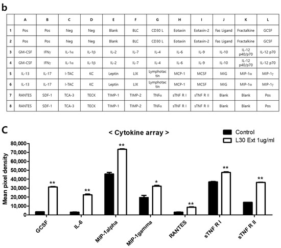 The effects of the L-30 extract on a cytokine array in RAW264.7 macrophages. (a) The two membranes were visualized using a CCD camera. (b) The positions of the cytokine spots on the membrane are represented. (c) The membranes of cytokines were quantified using Image J. The results show the mean ± standard deviation of two experiments. * p < 0.05 and ** p < 0.01 indicate a statistically significant difference compared to the control.
