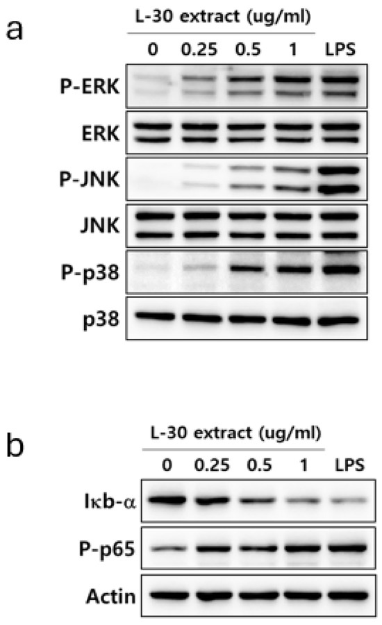 To elucidate the mechanism by which the L-30 extract activates the immune response, the activities of MAPK and NF-κB signaling were confirmed. LPS was used as a positive control for the activation of the MAPK and NF-κB pathways. RAW264.7 was treated with the L-30 extract at concentrations of 0.25, 0.5, and 1 µg/mL, along with 1 µg/mL of LPS for 30 min. Treatment with the L-30 extract resulted in a dose-dependent increase in the phosphorylation of ERK, JNK, and p38 compared to the control group (Figure 6a). To investigate the effects of the L-30 extract on the NF-κB signaling pathway, the degradation of IκB-α and the phosphorylation of p65 were assessed. The results showed that IκB-α was degraded by the L-30 extract, with a dose-dependent reduction. Furthermore, treatment with the L-30 extract led to an increase in p65 phosphorylation, demonstrating the activation of the NF-κB pathway (Figure 6b). These findings suggest that the activation of macrophages by the L-30 extract is mediated through the MAPK and NF-κB signaling pathways.