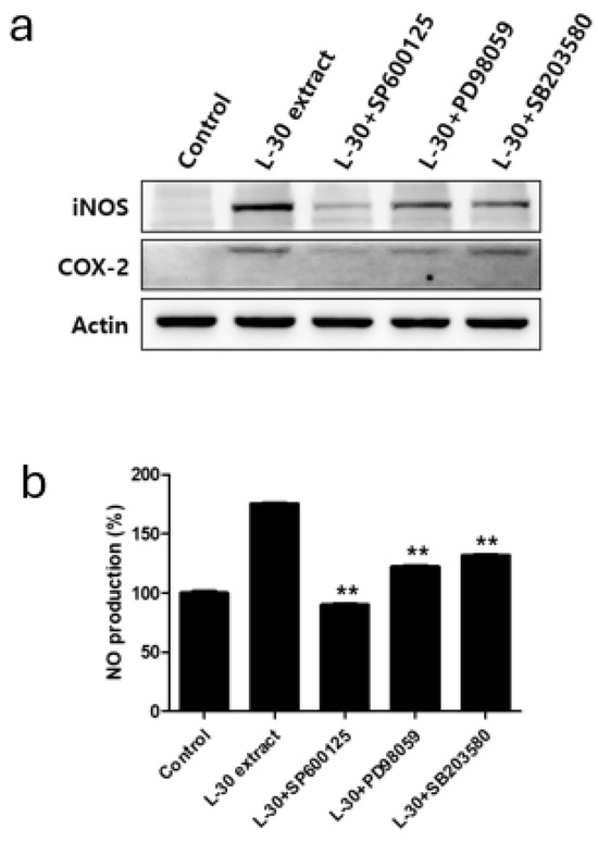 Effects of MAPK pathway inhibitor on immunostimulatory markers in RAW264.7 macrophages. (a) SP600125 (JNK inhibitor), PD98059 (ERK inhibitor), and SB203580 (p38 inhibitor) were pretreated for 2 h, and then L-30 extract (1 µg/mL) was treated for 24 h. Expression of iNOS and COX-2 was evaluated using Western blot analysis. (b) NO production of MAPK pathway inhibitor was examined using Griess reagent. Results show mean ± standard deviation of three experiments. ** p < 0.01 indicates statistically significant difference compared to L-30 extract.