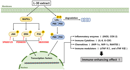Schematic diagram of MAPK and NF-κB signaling pathways in terms of macrophages induced via L-30 extract. When L-30 extract is treated to macrophages, IκB-α is degraded, and P65 is phosphorylated. In addition, MAPK pathways are phosphorylated to promote immune-related gene expression. As a result, expression of COX-2 and iNOS mRNA is induced to produce NO, thereby activating macrophages. In addition, L-30 extract induces immune responses by upregulating immune-related cytokines and chemokines.