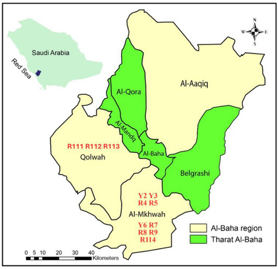 Map of Al-Baha region, southwest of Saudi Arabia, illustrating the areas and sites of collection of the 12 Arabian coffee cultivars; plotted and coded as given in Table 1.
