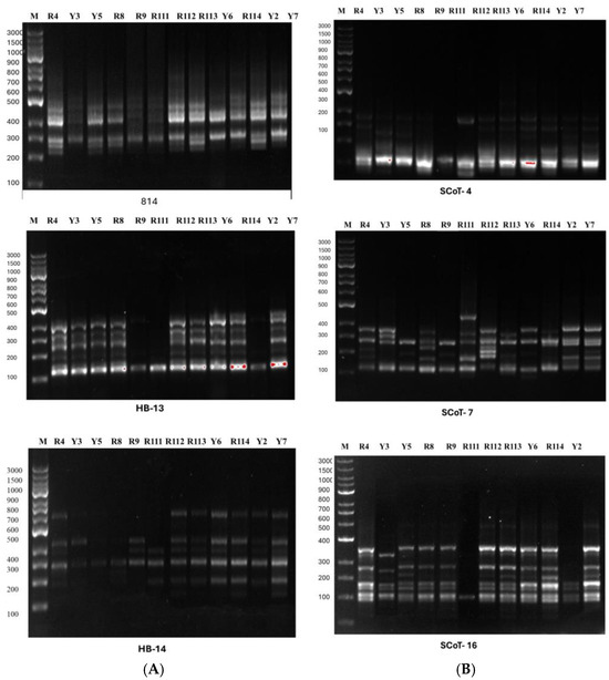 DNA was extracted and purified from the young leaves of mature plants of the collected samples of the Arabian coffee plants representing all the collected cultivars using Qiagen DNeasy™ Plant Minikit following the manufacturer’s protocol (Qiagen Inc, Valencia, CA, USA). Eight ISSR and nine SCoT primers were used for DNA fingerprinting. The selection of ISSR and SCoT primers was guided by their established effectiveness in earlier genetic diversity investigations. These primers are known for their capacity to generate polymorphic and reproducible bands, making them particularly suitable for analyzing the coffee genome, as evidenced by previous studies [15,16,17].