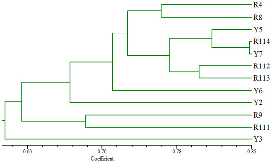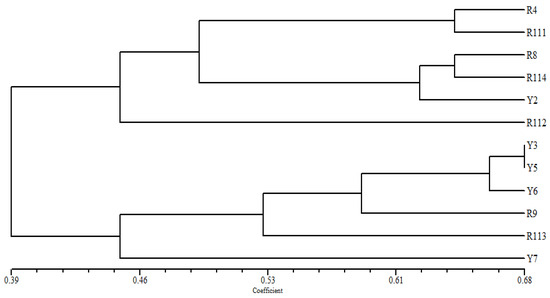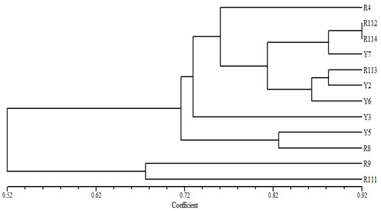 The cluster tree generated for the examined Arabica coffee cultivars based on the analysis of ISSR data (Figure 4) grouped the 12 cultivars into three groups. The R9 and R11 cultivars clustered in one group, representing the most divergent cultivars, collected from Al-Mehkwa and Qalwa, respectively. The second group comprised Y5 and R8 cultivars collected from the Al-Mehkwa region but from different GPS locations. The R112 and R114 cultivars clustered at a high similarity level, which were also collected from Qalwa and Al-Mehkwa, respectively. However, the results indicate that the cultivars of the Arabica coffee harvested from the same area were grouped into different clusters except for the Y5 and Y6 cultivars, which were found in the same cluster based on the combined analysis of morphological variations and the molecular polymorphism of the ISSR and SCoT markers (Table 1), indicating substantial genetic diversity within the cultivars of each region. This is not consistent with the results of Yunita et al. (2020), who reported that molecular data allowed for the grouping of the Arabica cultivars into three clusters correlated with their geographic distribution [22]. However, other studies have suggested a strong influence of geographic origin on diversity among the Arabica coffee cultivars [33,34].