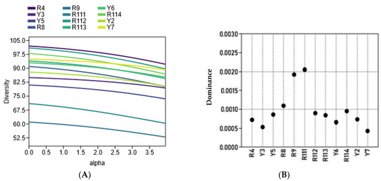 (A): The diversity profile and (B): alpha diversity, which were calculated using the Pasta pc program version 4.13, among the twelve studied C. arabica cultivars.