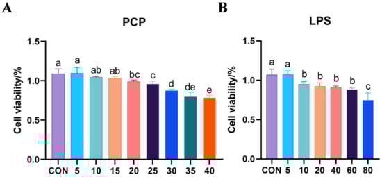 Cell vitality test results. (A) Cell proliferation situation, with PCP concentration on the horizontal axis and cell viability on the vertical axis. (B) The impact of different concentrations of LPS stimulation on the vitality of BEND: the horizontal axis represents the concentration of LPS and the vertical axis represents cell viability. All experiments were repeated more than three times and are presented as mean ± SD (significant differences (p < 0.05) between groups with different superscripts a, b, c, d and e).