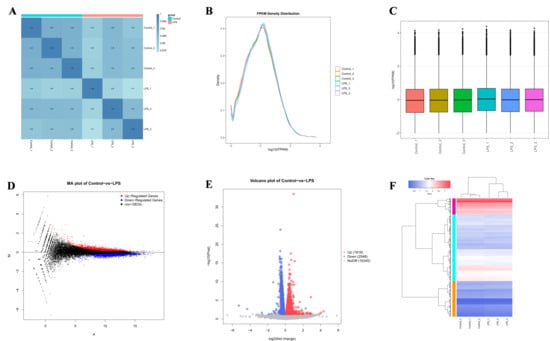 BEND LPS infects the sequencing results. (A) Correlation between the level of gene expression of heat maps in all samples: red represents the model group and blue represents the blank group. (B) Different samples of gene transcription/this Fpkm density figure; different colors represent different samples. (C) Fpkm box plots of genes/transcripts from different samples, with different colors representing different samples. (D) Differential gene Ma plot, with black representing normal genes, red representing upregulated genes, and blue representing downregulated genes. (E) Volcano map of DEGs, with black representing normal genes, red representing upregulated genes, and blue representing downregulated genes. (F) Heatmap of differential gene expression, with the abscissa representing samples and the ordinate representing kinship. Different colors distinguish the distribution of gene expression.
