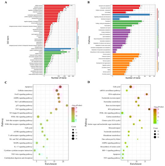 To further investigate the roles of the DEGs, enrichment analyses were conducted using the Gene Ontology (GO) and Kyoto Encyclopedia of Genes and Genomes (KEGG) databases. Figure 3A illustrated the enrichment of 3554 GO terms, encompassing categories such as cellular processes, metabolism, and biological functions. The KEGG enrichment results presented in Figure 3B delineate 250 signaling pathways that are categorized into five branches, including transport, catalysis, cell growth, and death. Notably, the upregulated DEGs were associated with apoptosis, whereas the downregulated DEGs corresponded to the cell cycle, as shown in Figure 3C,D.