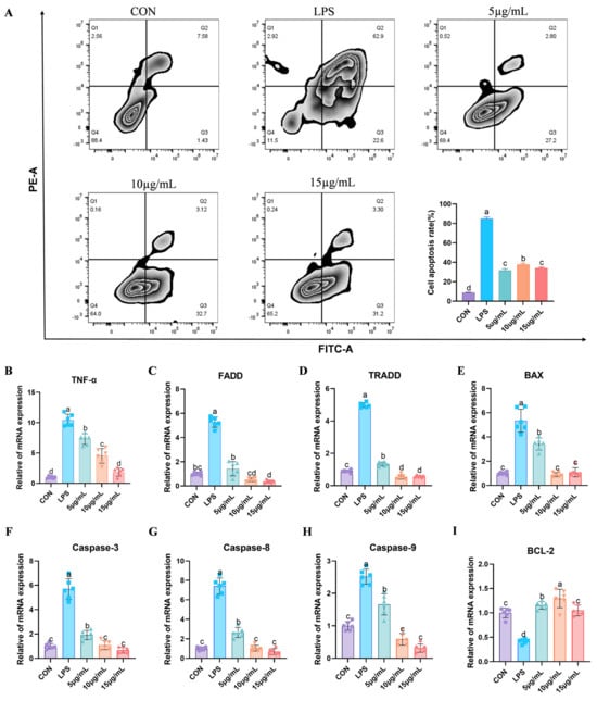 Flow cytometry detection of cell apoptosis and the expression levels of apoptosis-related genes. (A) BEND cell apoptosis, (B) TNF-α mRNA expression, (C) FADD mRNA expression, (D) TRADD mRNA expression, (E) BAX mRNA expression, (F) Caspase-3 mRNA expression, (G) Caspase-8 mRNA expression, (H) Caspase-9 mRNA expression, (I) BCL-2 mRNA expression. All experiments were repeated more than three times and are presented as mean ± SD (significant differences (p < 0.05) between groups with different superscripts a, b, c, and d).