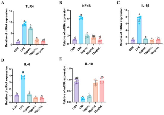 Detect the expression levels of inflammatory-related gene mRNA using the RT-qPCR method. (A) TLR4 mRNA expression, (B) NFκB mRNA expression, (C) IL-1β mRNA expression, (D) IL-6 mRNA expression, (E) IL-10 mRNA expression. All experiments were repeated more than three times and are presented as mean ± SD (significant differences (p < 0.05) between groups with different superscripts a, b, c, and d).