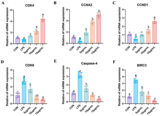 Fluorescence quantitative validation of transcriptome sequencing results. (A) CDK4 mRNA expression, (B) CCNA2 mRNA expression, (C) CCND1 mRNA expression, (D) CDK6 mRNA expression, (E) Caspase-4 mRNA expression, (F) BIRC3 mRNA expression. All experiments were repeated more than three times and are presented as mean ± SD (significant differences (p < 0.05) between groups with different superscripts a, b, c, d and e).