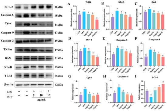 This study assessed the expression levels of proteins associated with inflammation and apoptosis signaling pathways, as depicted in Figure 7. Following exposure to LPS, the protein expression levels of TLR4 (Figure 7A), NFκB (Figure 7B), BAX (Figure 7C), TNF-α (Figure 7D), Caspase-3 (Figure 7E), Caspase-9 (Figure 7F), Cyt-c (Figure 7G), and Caspase-8 (Figure 7H) exhibited a significant increase compared to the control group (p < 0.05). Treatment with PCP effectively reversed this situation. Notably, the expression of the anti-apoptotic protein BCL-2 (Figure 7I) was significantly reduced in the LPS group compared to the control group (p < 0.05). Post PCP intervention, the protein level of BCL-2 gradually rose, with a significant increase observed in the 10 µg/mL and 15 µg/mL groups compared to the control group (p < 0.05).