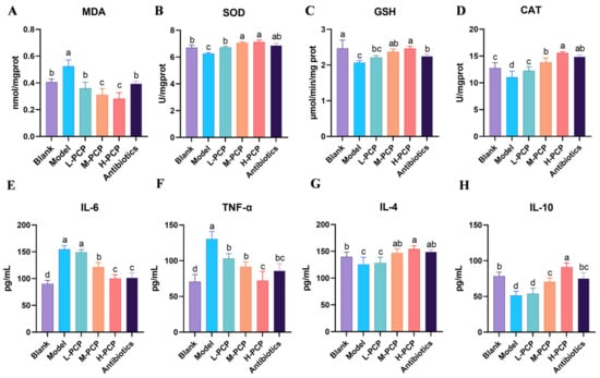 The effects of PCP on liver antioxidant and serum inflammatory factors in rats with endometritis, grouped by blank, low, medium, and high doses, and antibiotic group. (A) Liver MDA levels, (B) liver SOD levels, (C) liver GSH levels, (D) liver CAT levels, (E) serum IL-6 levels, (F) serum TNF-α levels, (G) serum IL-4 levels, (H) serum IL-10 levels. All experiments were repeated more than three times and are presented as mean ± SD (significant differences (p < 0.05) between groups with different superscripts a, b, c, and d).
