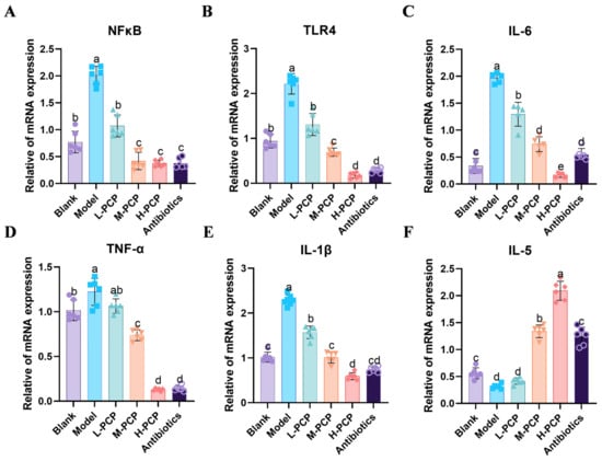 The results of mRNA expression of related inflammatory factors are illustrated in Figure 2. Following a mixed bacterial infection, the experimental groups showed significantly higher levels of NFκB (Figure 9A), TLR4 (Figure 9B), IL-6 (Figure 9C), TNF-α (Figure 9D), and IL-1β (Figure 9E) compared to the control group (p < 0.05). In H-PCP and M-PCP groups, the inflammatory markers exhibited a more pronounced reduction (p < 0.05), and the group receiving antibiotics also showed a significant improvement in inflammatory markers. Additionally, post-bacterial infection, the expression of IL-5 (Figure 9F) was notably decreased compared to the control group (p < 0.05). Compared to the model group, the middle- and high-dose groups and the antibiotic group had a significant increase in the expression level (p < 0.05), and there was no significant difference between the antibiotic group and the blank group (p > 0.05).